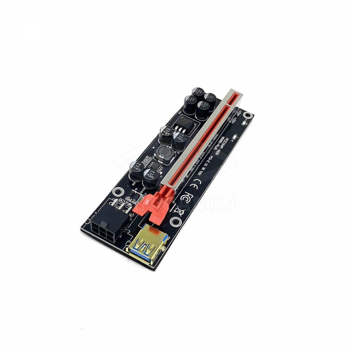 Переходник райзер для видеокарт PCI Riser 009S plus для майнинга используется для подсоединения плат PCI-Express x16 к слоту PCI-Express x1. На адаптере имеется разъем 6-pin, через который можно подключить дополнительное питание. На плате размещены светодиоды +12В и +3,3В. Предусмотрена фиксированная пряжка, позволяющая легко вставить и извлечь видеокарту. В комплекте есть USB кабель и кабель питания.